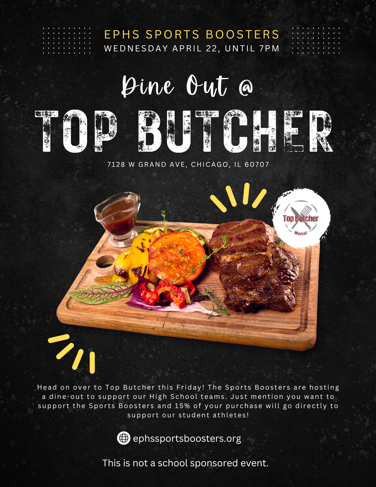Top Butcher Dine-Out Fundraiser Wednesday, April 22, 2026 4:00 PM 7:00 PM Top Butcher 7128 West Grand Avenue Chicago, IL, 60707 United States (map) Google Calendar ICS Head on over to Top Butcher! The Sports Boosters are hosting a dine-out to support our High School teams. Just mention you want to support the EPHS athletes and provide the below!